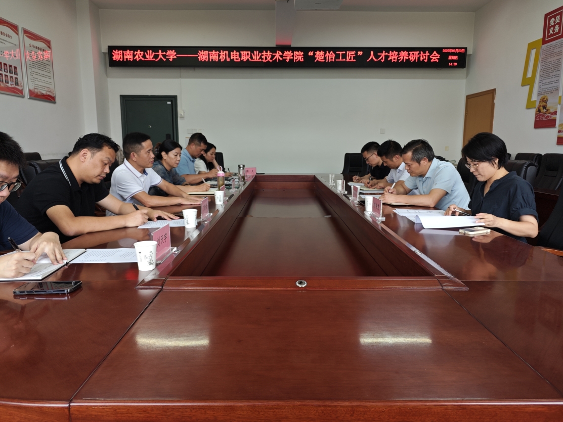 为深化产教融合,探索高素质技术技能型人才培养新路径,湖南农业大学与湖南机电职业技术学院于6月20日下午在湖南农业大学八教南311会议室召开“楚怡工匠”人才培养专题研讨会。会议由湖南农业大学机电工程学院副院长吴志立主持,两校教学管理部门及二级学院领导、专业负责人、骨干教师参加。
