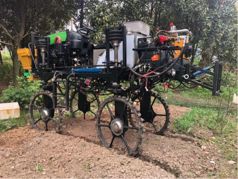 [1] 高地隙参数自适应动力底盘及其配套关键技术。根据南方农作物种类和种植模式多样化现状,针对水田作物田间管理机械沉陷量大、行走转向伤苗严重、不同作物和不同生长期的行距和植株高度变化大等问题,研发了适合南方水田的轮距、轴距、地隙自动可变的动力平台,可根据作物行距调整轮距,根据植株高度、田埂高度和稳定性要求调整地隙及轴距。