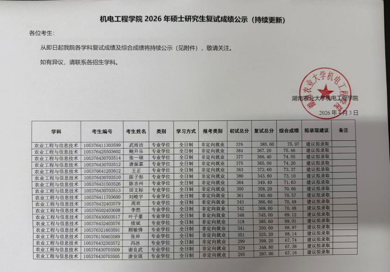 湖南农业大学机电工程学院2026年博士研究生招生复试与录取工作方案
