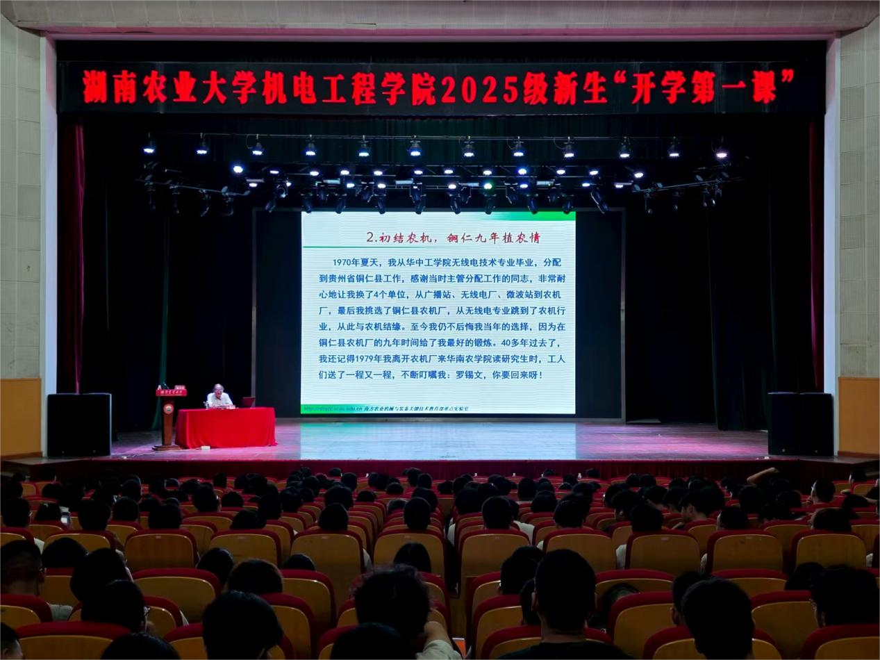 机电工程学院展开“开学第一课”活动,中国工程院院士、农业机械化专家罗锡文以“牢记初心使命,矢志农机创新”为主题,为学院2025级750名新生带来“开学第一课”。