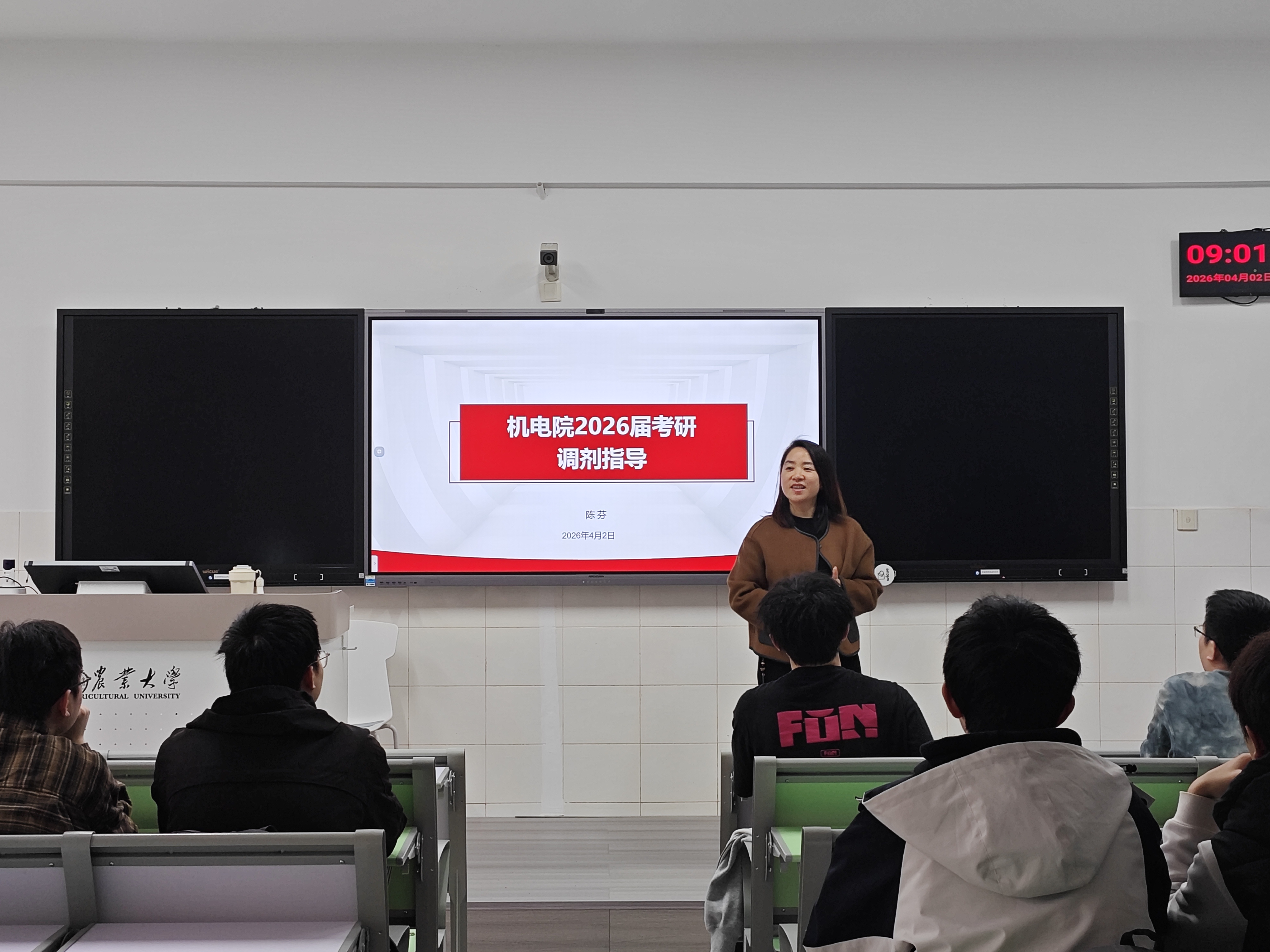 本网讯(机电工程学院 张凤 裴双成)为帮助2026届考研学子精准把握复试要点、科学规划调剂路径,4月2日上午9时,机电工程学院在八教北320会议室举办考研复试调剂专题指导会。会议邀请湖南农业大学创新创业与就业指导处、创新创业学院陈芬老师作专题辅导,由学院就业专干张凤老师主持,2026届考研学生参加。